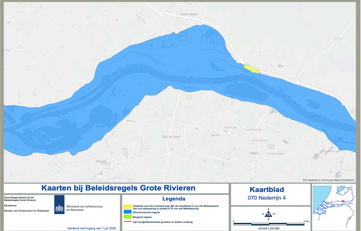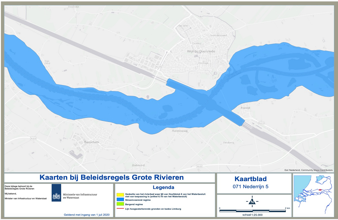 Het gaat bij uiterwaarden vooral om het zogenaamde “stroomvoerend regiem”, zie het blauwe gebied aangegeven in de twee bijgaande figuren. Hierin zie je het riviertraject van Lienden tot voorbij Beusichem. Het hele gebied tussen de winterdijken, ook het eiland van Maurik en de oude steenfabrieken behoren tot het stroomvoerend regiem.
